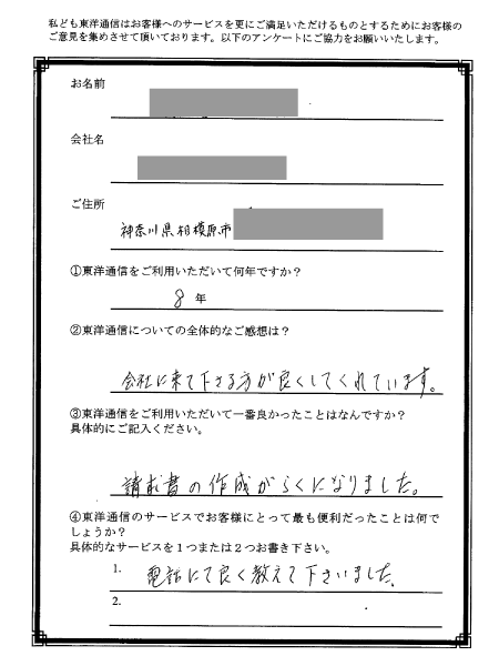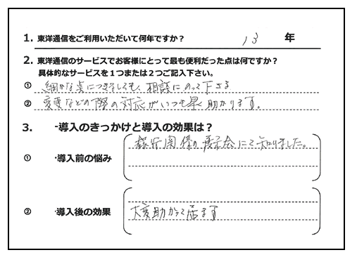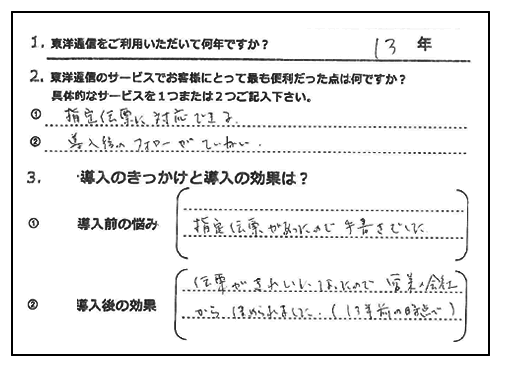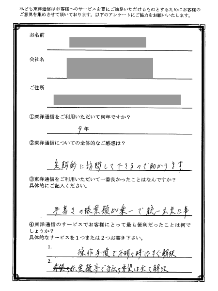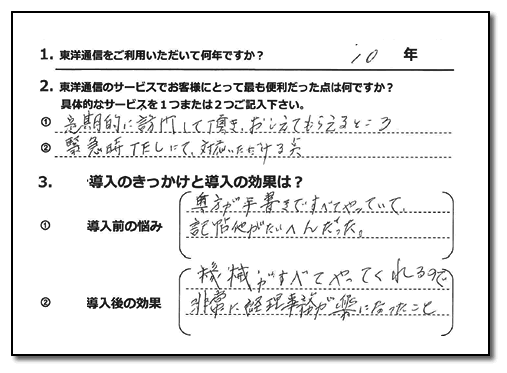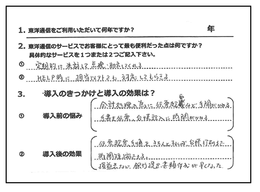事務の効率化に成功したので、本来の仕事に費やす時間が増えて、とても助かっています。事務作業に掛かっていた時間も大幅に削減しました。