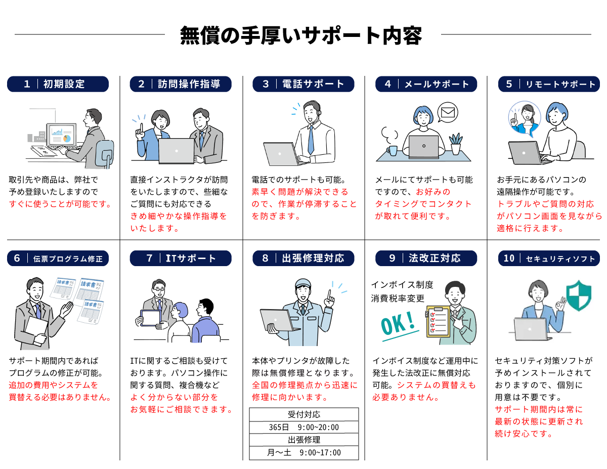 営業さんも、社内のシステム担当さんも電話すればすぐに対応してくれるのでとても助かります。電話で解決できない時は、遠隔でリモートサポートを無料でやってくれるので安心です。