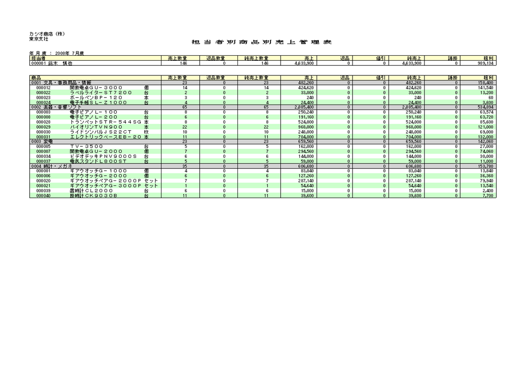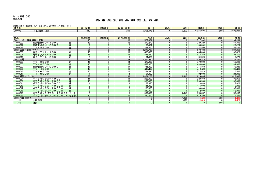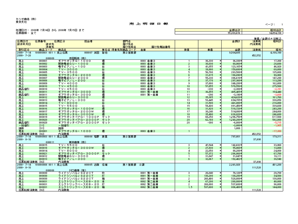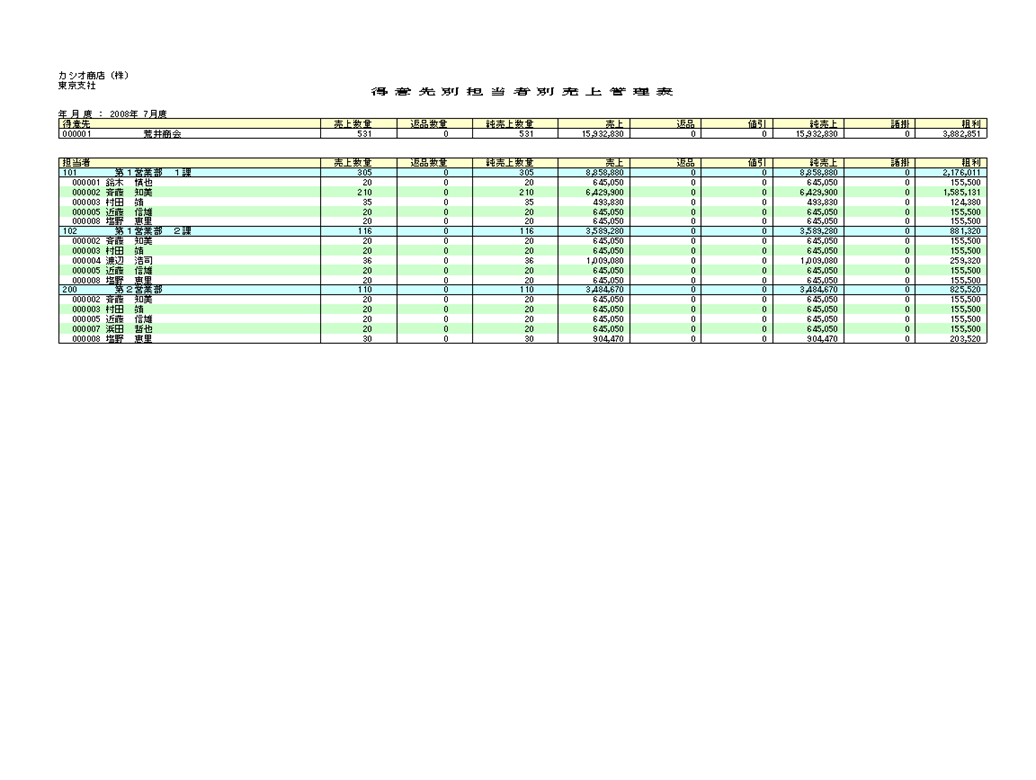 カシオの楽一は、売上伝票をもとに、得意先・商品・担当者別に出力できます。