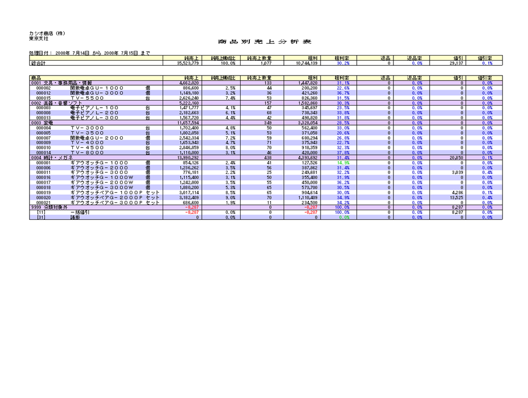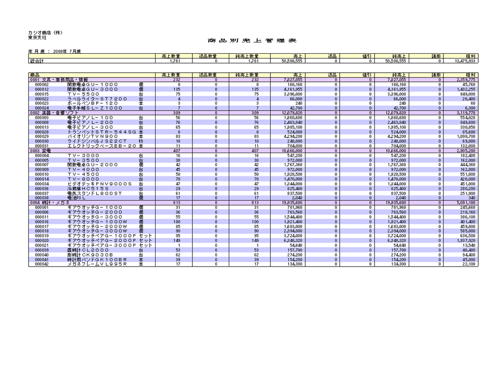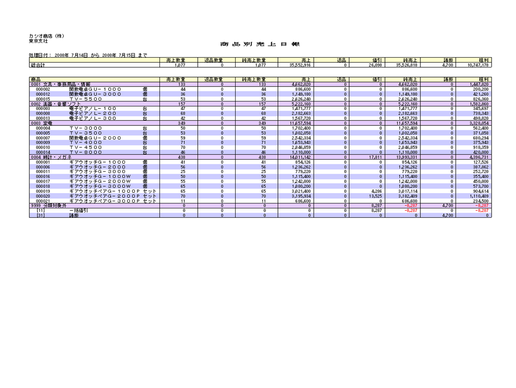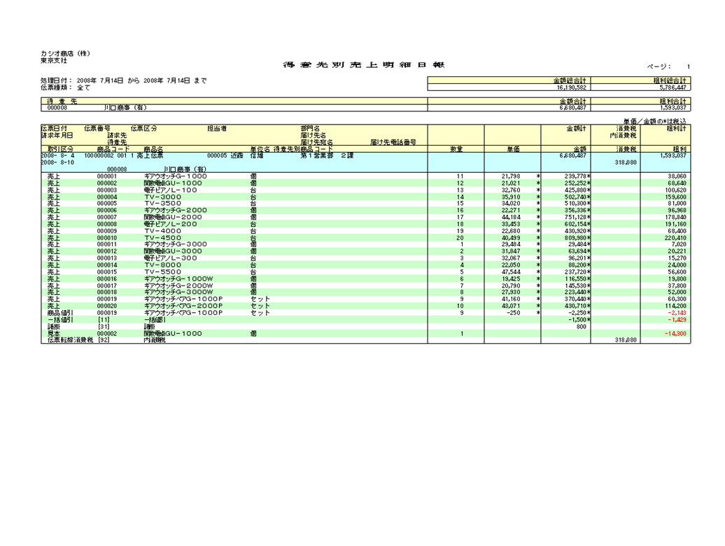 カシオの楽一は、売上伝票をもとに、得意先・商品・担当者別に出力できます。