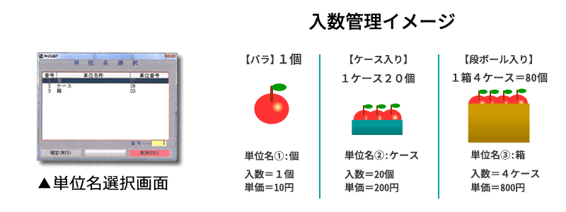 商品マスタに3種類の単位を用意。各単位ごとに入数と単価の登録が可能で、
