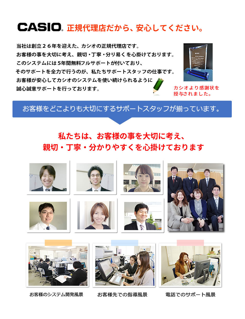 担当してくれているスタッフの方にもとても親身なって対応してくれてカシオのシステム以外にもインターネットの不具合や迷惑メールについての相談も本当に気軽にできるので、無くてはならない存在になっています。