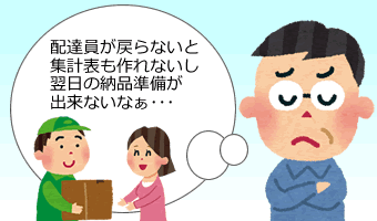 配達員の帰社後の報告を受けて集計作業を開始していた。集計表が完成するまで各店舗での販売実績の把握ができず、翌日の納品準備を行うのに時間が遅くなってしまった。