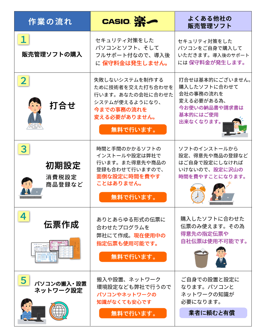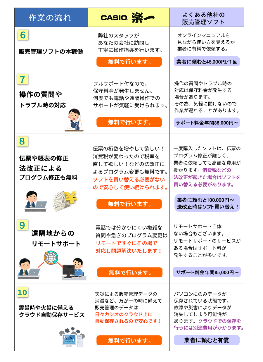 他社の一般的な販売管理ソフトは、ソフト以外に必要なユースウェアは別料金になっております。例えば、初期設定での商品登録や得意先登録、伝票プログラム修正、訪問での操作指導など、別途保守料金が必要となります。導入前にその点にご注意ください。以下に他社との比較表がございますので、ご参考までにご覧下さい。