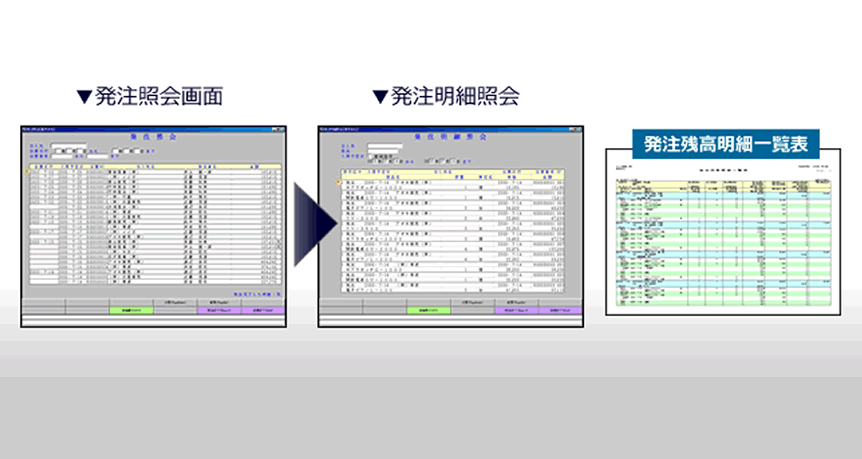 その発注残情報を仕入先別や入荷予定日別に画面に表示することができます(発注照会画面)。