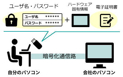 楽一のリモートワークは、ユーザ名・パスワード設定、ハードウェア固有情報や電子証明書を組み合わせた多要素認証を用い、会社のパソコンへの不正な接続を阻止するので安心です!