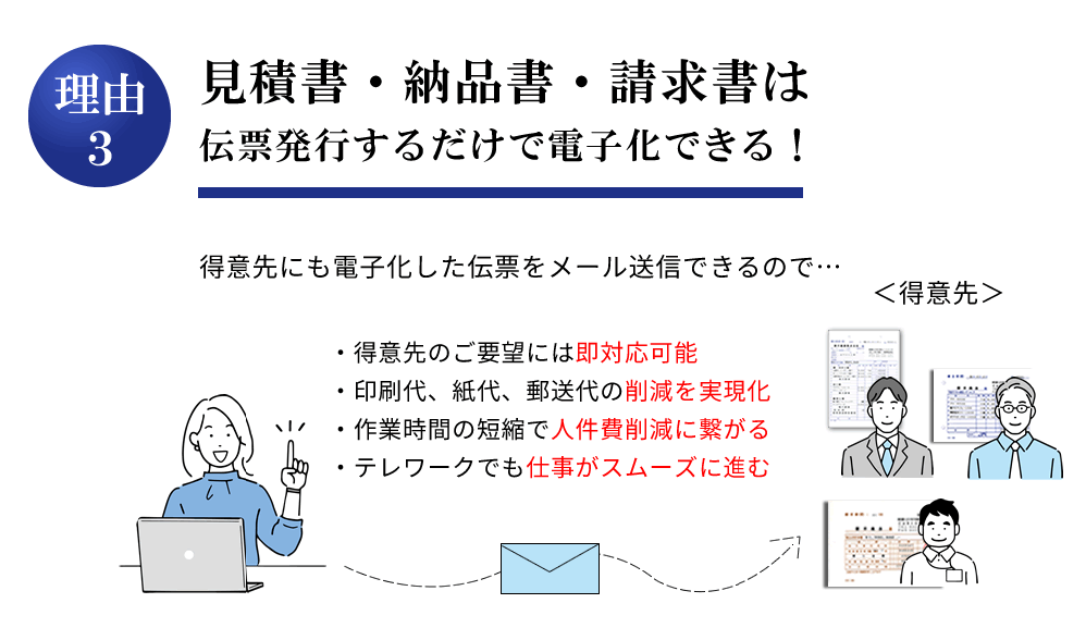 見積書を作成すると請求書に同じ内容が 引き継がれ、都度入力をする必要もなく 作業効率も上がりました。また、売掛伝票や封筒印刷なども活用しています。