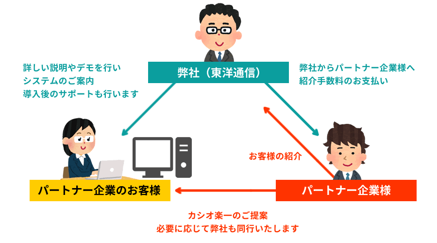カシオ楽一をあなたのお客様に提案していただくだけで、後は弊社がお客様にシステムの詳細説明や機械を実際にお持ちし、動きを見てもらうデモストレーション等を行います。導入に至った場合は紹介手数料をお支払いいたしますもちろん、導入後はお客様へのサポートも弊社が行います。パートナー企業様は紹介していただくだけでOKなのでご安心下さい。