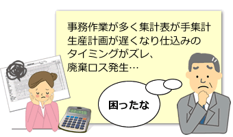 日計表を電卓で手集計で作成し、翌日の生産計画を立てていた。計算ミスや、作成のタイミングがズレて生産計画と仕込みの間に誤差が生じ、結果廃棄ロスが増えていた。