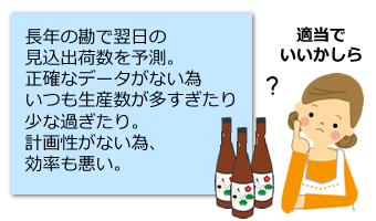 長年の勘や、季節感で翌日の見込出荷数を予測し、生産していた。過去の売上データなどは特に気にせず、その場で自分のさじ加減で決めていた為、在庫過多になったり、足りなかったりという状態に陥ってしまった。
