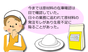 導入前は、製品を生産する為に必要な原材料は目で確認し、その都度発注していた。日常業務に追われて原材料が不足していても気が付かず、発注漏れにより製品を生産できないという状況になることもあった。