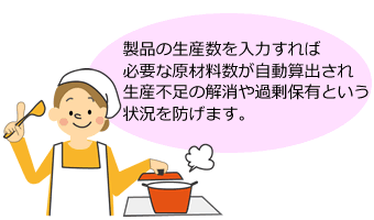 商品の生産数を入力すると、その商品に必要な原材料を自動で計算してくれます。品繰り表で算出された予測データを元に、必要な原材料数の表示がされるので、品繰り表と一緒にご活用いただくと、更に経営効率がアップします。