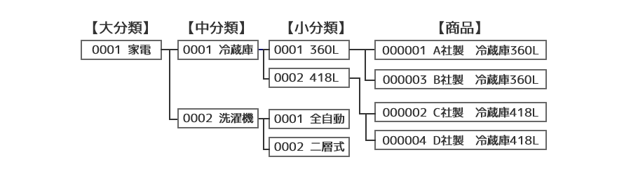 大中小の3階層に商品を分類できるよう「大分類」「中分類」「小分類」を設定できます。階層は「大中小分類使用/大中分類使用/大分類使用」から選択できます。