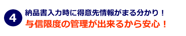 納品書(見積書)入力時に、得意先コードにカーソルが当たると得意先情報のボタンが表示され、そのボタンをクリックすると、更に詳細な得意先情報を確認することが可能です。与信限度額や売上累計額、売掛残高などが当月、前月、前々月まで自動表示されます。これで、エクセルなどを開かなくても一度で確認できるので、手間も時間もかかりません!