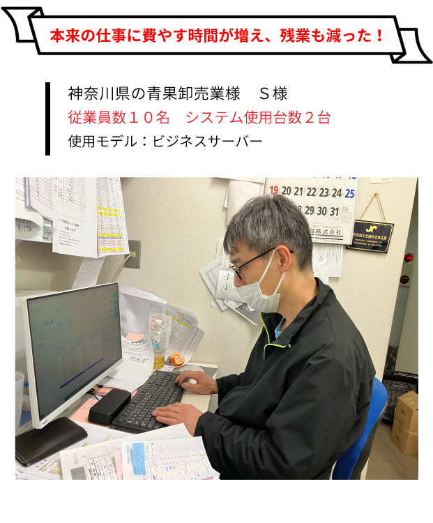 営業の方が定期的に訪問してくれるので、日常的にコミュニケーションが取れて安心です。他の青果業の事例も紹介してもらえるため、 自分たちの業務改善にもつながっています。困った時には電話一本でリモート対応していただけますし、機器本体のサポートも任せられるので余計な心配をする必要がありません。