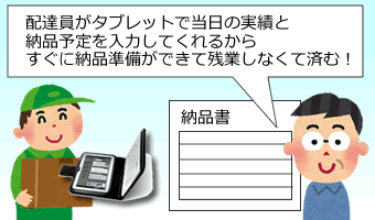 各配達員がタブレットやスマートフォンなどの外部端末から配達先店舗の“当日の実績”と“翌日の納品予定”を入力するとリアルタイムで集計が可能。すぐに納品準備の作業に取り掛かれます。これで残業時間も大幅に削減できます。
