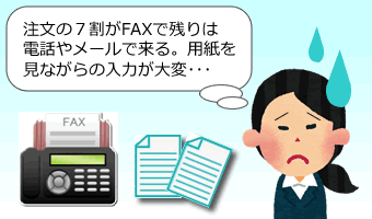 飲食店からの注文は7割がFAXで残りは電話注文やメールでの注文を受けていた。その為、毎朝の集計や確認、入力作業に時間を費やしていた。配達前の商品ピッキング作業に与える影響が多く、効率がとても悪かった。